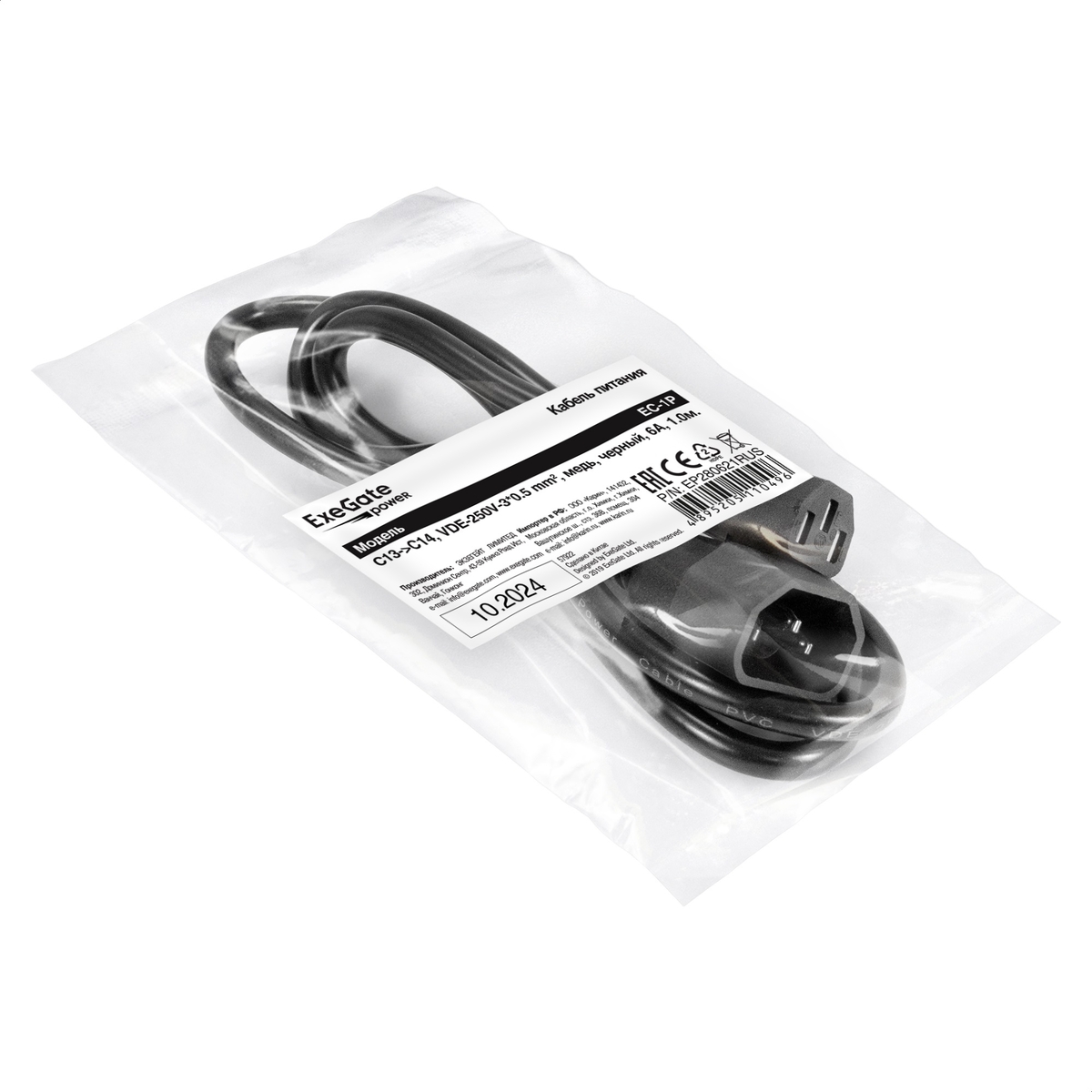 Кабель питания ExeGate Power EC-1P-C13->C14/3x0.5Cu (C13->C14, VDE-250V-3*0.5 mm2, медь, черный, 6A, 1м)