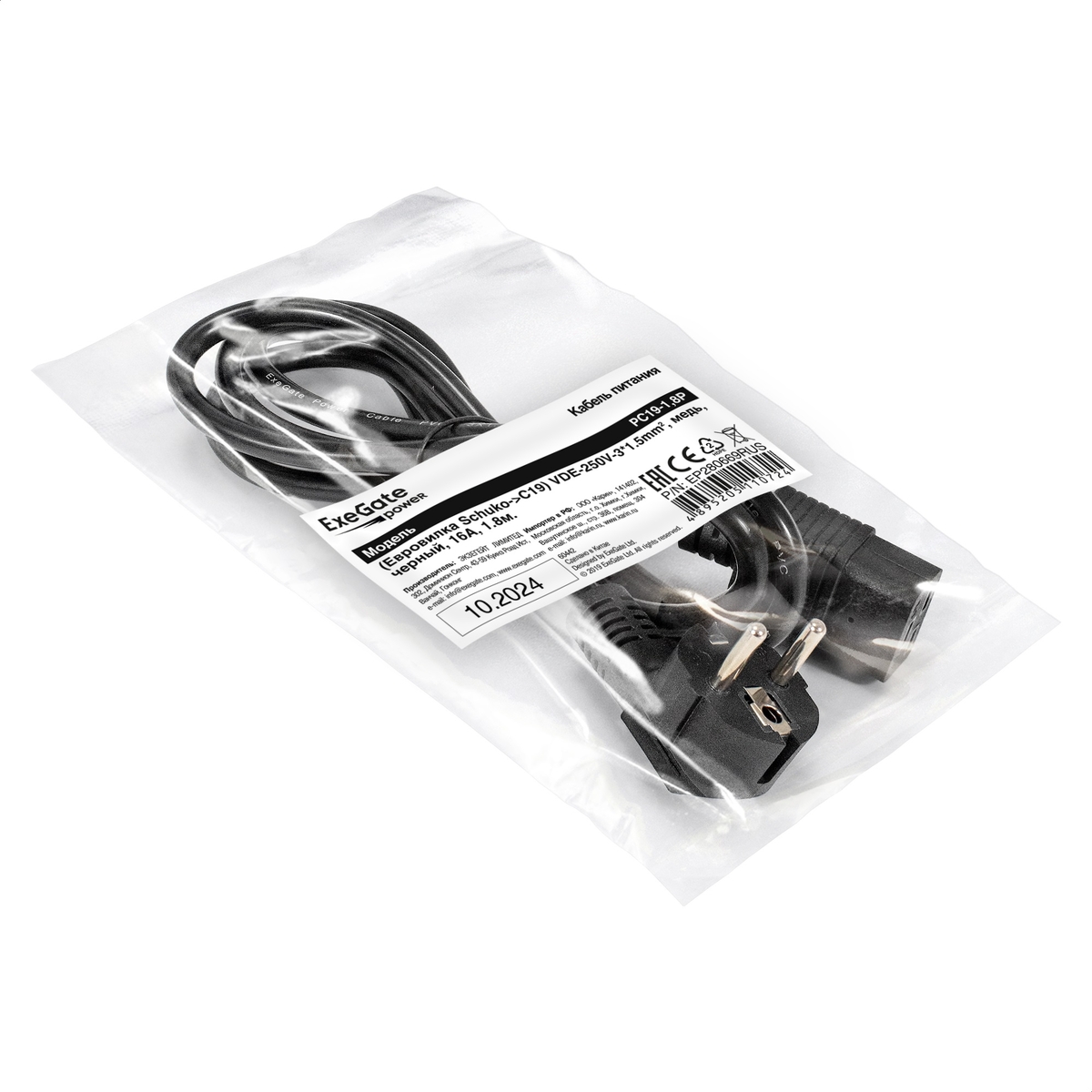 Кабель питания ExeGate Power PC19-1.8P-Schuko->C19/3x1.5Cu (Евровилка Schuko->C19, VDE-250V-3*1.5mm2, медь, черный, 16А, 1.8м)