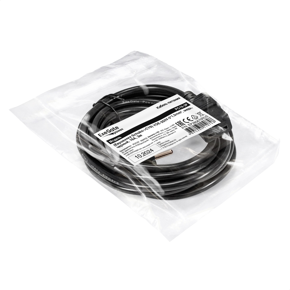Кабель питания ExeGate Power PC19-3P-Schuko->C19/3x1.5Cu (Евровилка Schuko->C19, VDE-250V-3*1.5mm2, медь, черный, 16А, 3м)