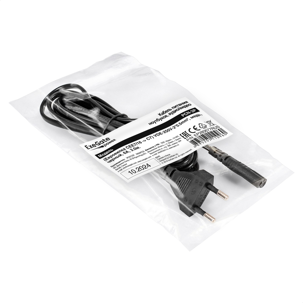 Кабель питания ноутбуков, аудио/видео ExeGate Power PCN-3P-EU->C7/2x0.5Cu (Евровилка CEE7/16->C7, VDE-250V-2*0.5mm2, медь, черный, 6A, 3м)