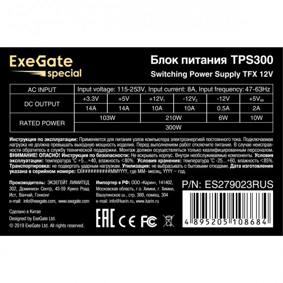 Блок питания 300W ExeGate TPS300 (TFX, 8cm fan, 24pin, (4+4)pin, PCI-E, 3xSATA, 2xIDE, black)