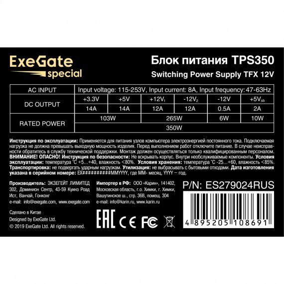 Блок питания 350W ExeGate TPS350 (TFX, 8cm fan, 24pin, (4+4)pin, PCI-E, 3xSATA, 2xIDE, black)