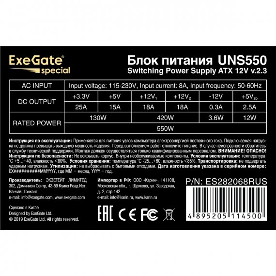 Exegate ES282068RUS-PC Блок питания 550W UNS550