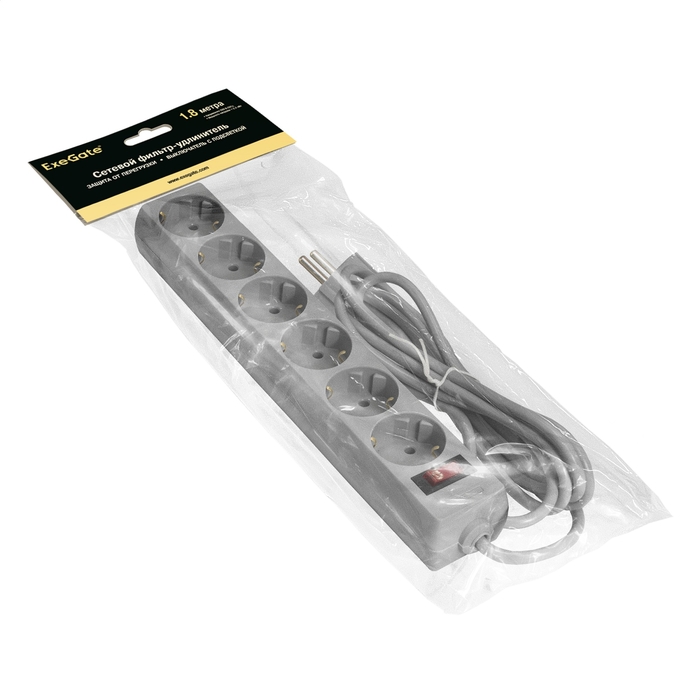 Сетевой фильтр ExeGate SP-6-1.8G (6 евророзетки с заземлением, 1.8м, защита от перегрузки, выключатель с подсветкой, серый)