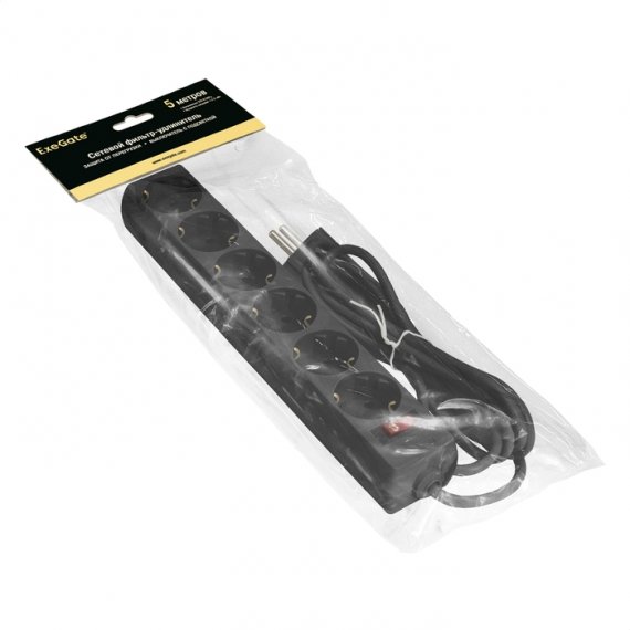 Сетевой фильтр ExeGate SP-6-5B (6 евророзетки с заземлением, 5м, защита от перегрузки, выключатель с подсветкой, черный)