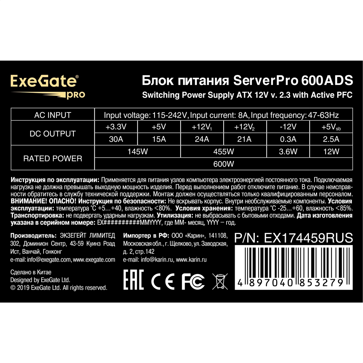 Exegate EX174459RUS Серверный БП 600W ServerPRO-600ADS