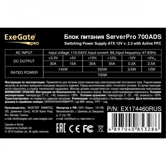 Серверный БП 700W ExeGate ServerPRO-700ADS (ATX, APFC, КПД 82% (80 PLUS), 2x8cm fans, 24pin, 2x(4+4)pin, 2xPCI-E, 10xSATA, 5xIDE, black)