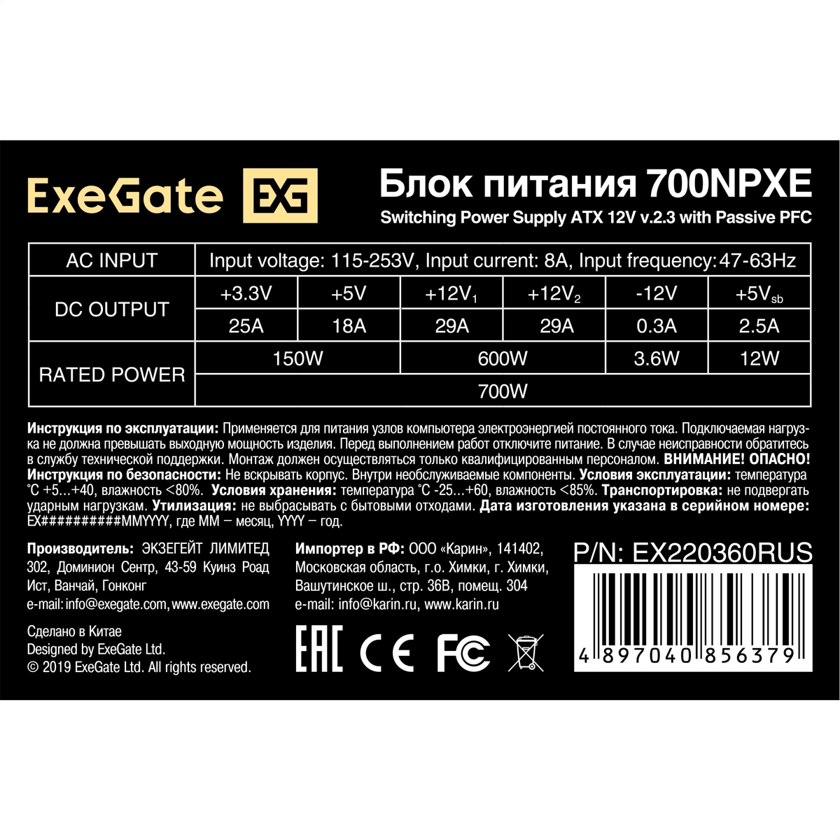 Блок питания 700W ExeGate 700NPXE (ATX, PPFC, PC, 12cm fan, 24pin, 2x(4+4)pin, 2xPCI-E, 5xSATA, 3xIDE, black, кабель 220V в комплекте 1,8м)