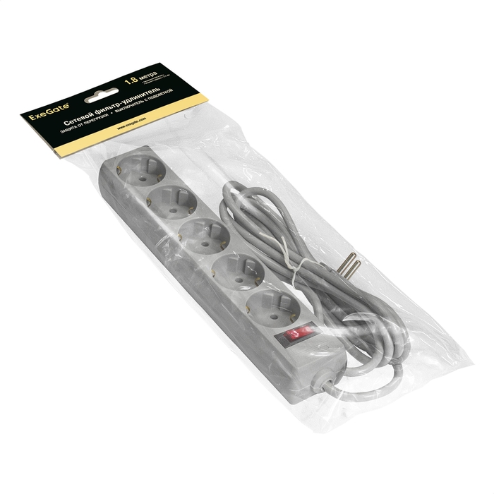 Сетевой фильтр ExeGate SP-5-1.8G (5 евророзетки с заземлением, 1.8м, защита от перегрузки, выключатель с подсветкой, серый)