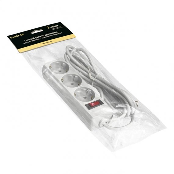 Сетевой фильтр ExeGate SP-3-3W (3 евророзетки с заземлением, 3м, защита от перегрузки, выключатель с подсветкой, белый)