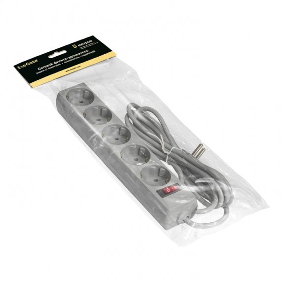 Сетевой фильтр ExeGate SP-5-5G (5 евророзетки с заземлением, 5м, защита от перегрузки, выключатель с подсветкой, серый)