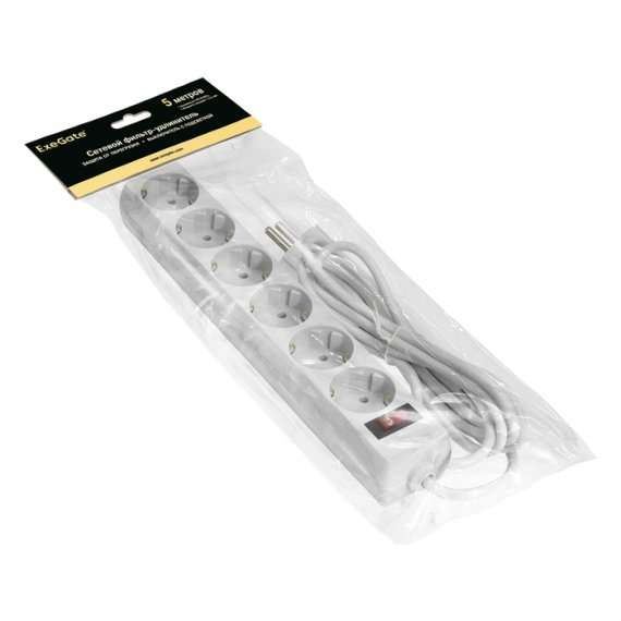 Сетевой фильтр ExeGate SP-6-5W (6 евророзетки с заземлением, 5м, защита от перегрузки, выключатель с подсветкой, белый)