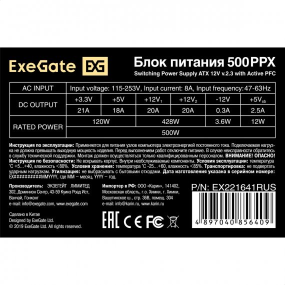 Блок питания 500W ExeGate 500PPX (ATX, APFC, SC, КПД 80% (80 PLUS), 14cm fan, 24pin, (4+4)pin, 2xPCI-E, 4xSATA, 3xIDE, кабель 220V 1,8м с защитой от выдергивания, black, RTL)