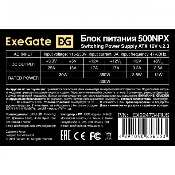 Exegate EX224734RUS-S Блок питания 500W 500NPX