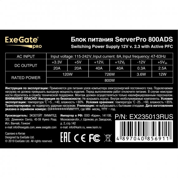 Exegate EX235013RUS Серверный БП 800W ServerPRO-800ADS