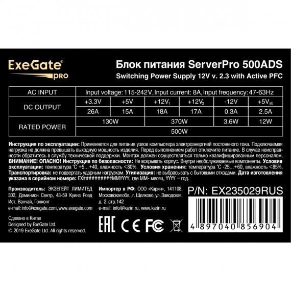 Exegate EX235029RUS Серверный БП 500W ServerPRO-500ADS