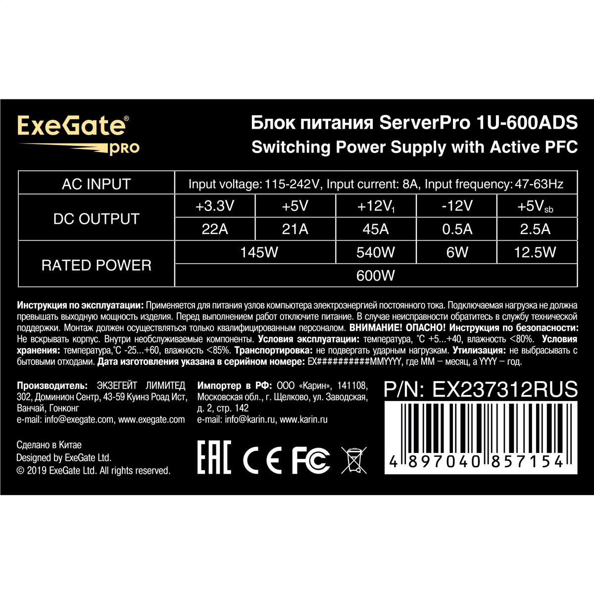 Exegate EX237312RUS Серверный БП 600W ServerPRO-1U-600ADS