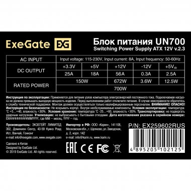 Блок питания 700W ExeGate UN700 (ATX, PC, 12cm fan, 24pin, 2x(4+4)pin, 2xPCI-E, 5xSATA, 3xIDE, кабель 220V в комплекте 1,8м)