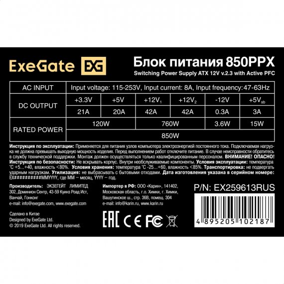Exegate EX259613RUS Блок питания 850W 850PPX