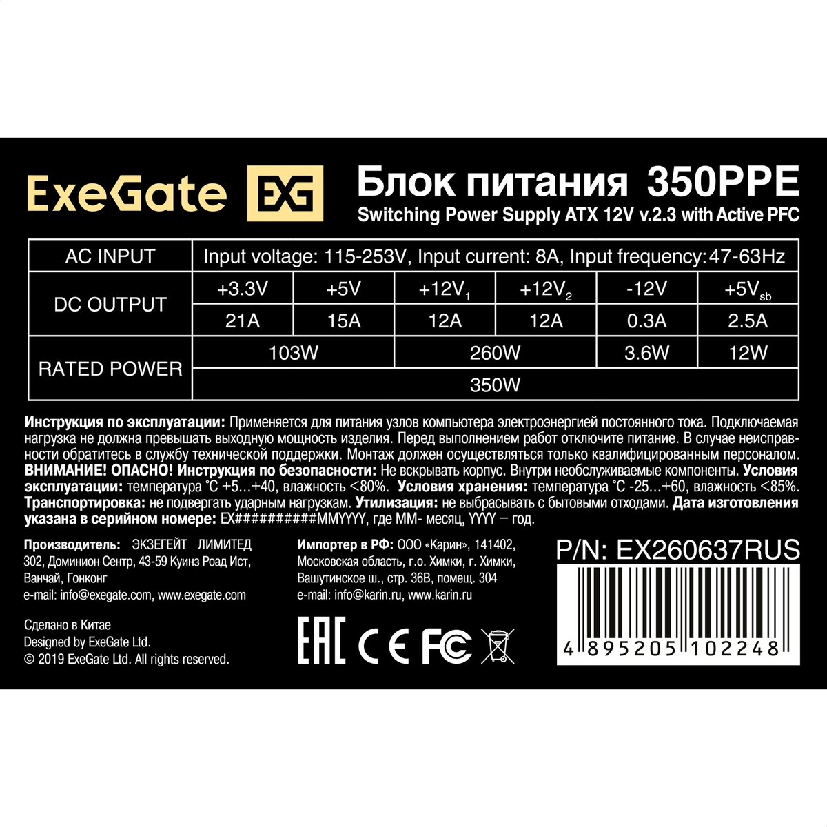 Блок питания 350W ExeGate 350PPE (ATX, APFC, PC, КПД 80% (80 PLUS), 12cm fan, 24pin, (4+4)pin, PCI-E, 5xSATA, 3xIDE, black, кабель 220V в комплекте 1,8м)