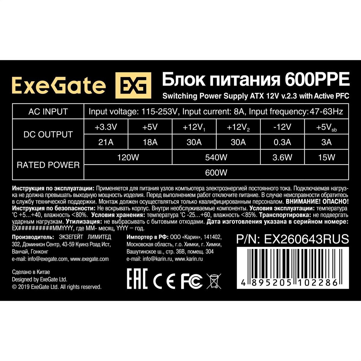 Exegate EX260643RUS-S Блок питания 600W 600PPE