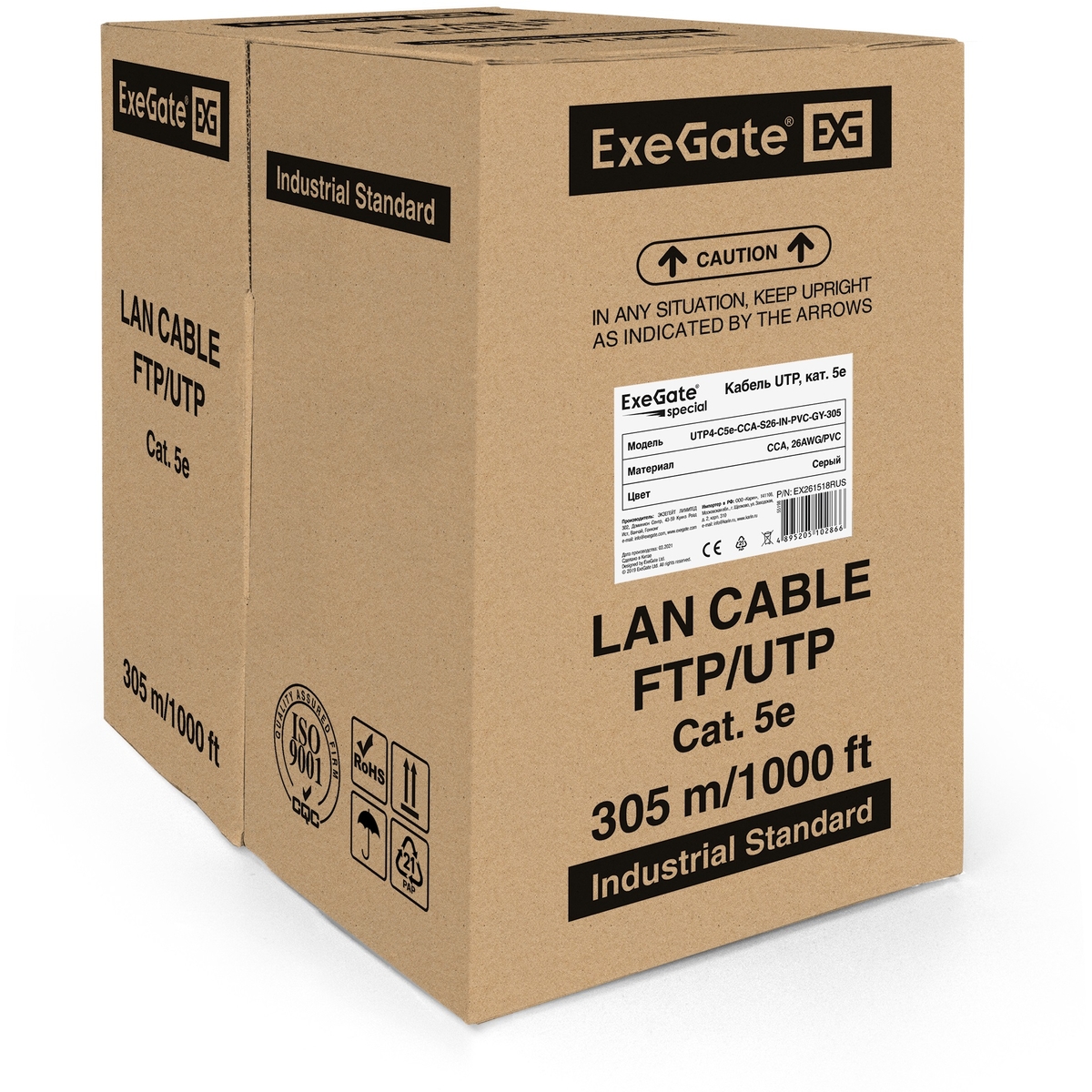 Кабель ExeGate UTP4-C5e-CCA-S26-IN-PVC-GY-305 UTP 4 пары кат.5e CCA, 26AWG, бухта 305м, серый, PVC