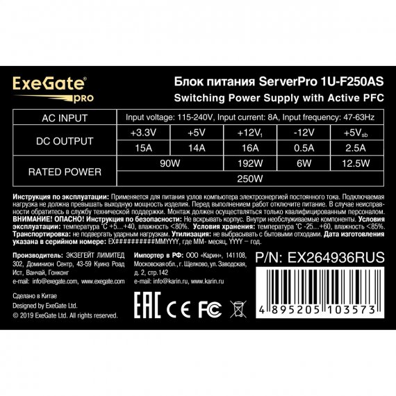 Exegate EX264936RUS Серверный БП 250W ServerPRO-1U-F250AS