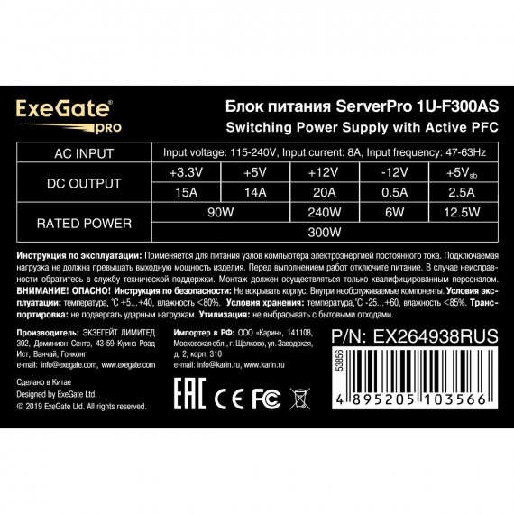 Exegate EX264938RUS Серверный БП 300W ServerPRO-1U-F300AS
