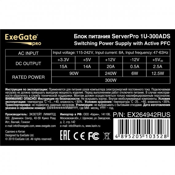 Exegate EX264942RUS Серверный БП 300W ServerPRO-1U-300ADS