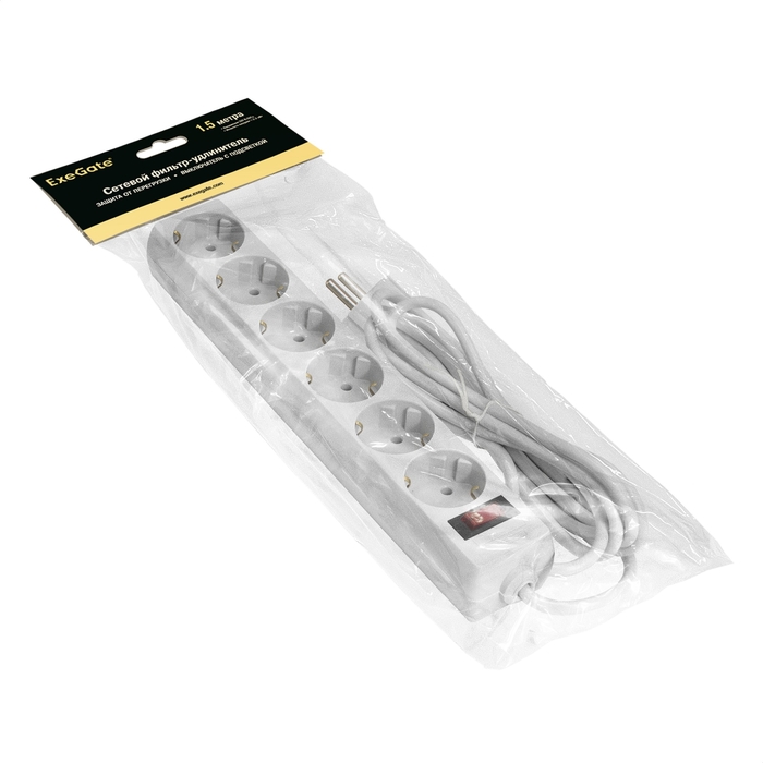 Сетевой фильтр ExeGate SP-6-1.5W (6 евророзетки с заземлением, 1.5м, защита от перегрузки, выключатель с подсветкой, белый)