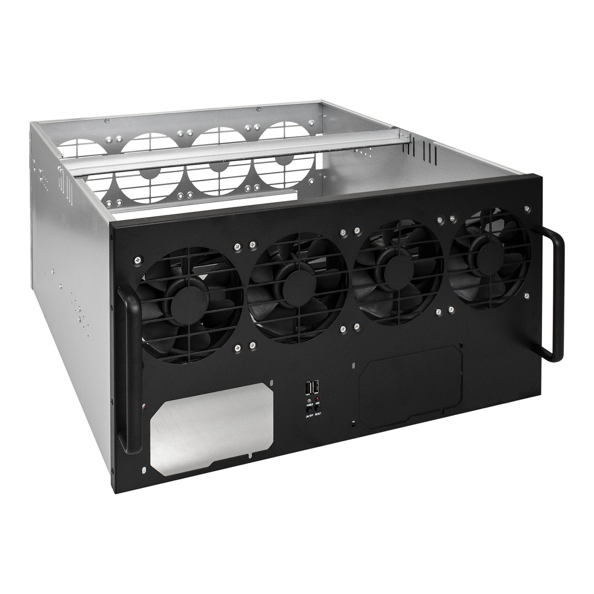 Корпус для майнинга ExeGate Pro 8-430 <без БП, 2*USB, 4*fan 120мм, места под: 8 видеокарт, 2 БП>