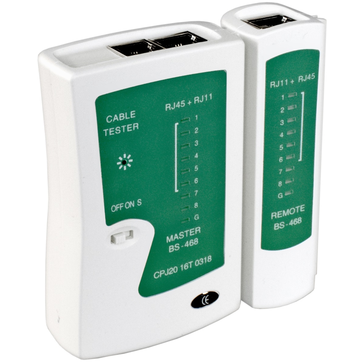 Тестер для телефонного кабеля и кабелей на основе витых пар. Определяет правильность соединения каждого провода в кабеле, правильность обжима, наличие обрыва или короткого замыкания, а также целостность экрана для экранированной витой пары.