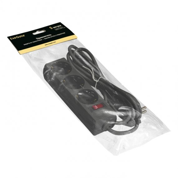 Удлинитель ExeGate EC-3-5B (3 евророзетки с заземлением, 5м, защита от перегрузки, выключатель с подсветкой, черный)