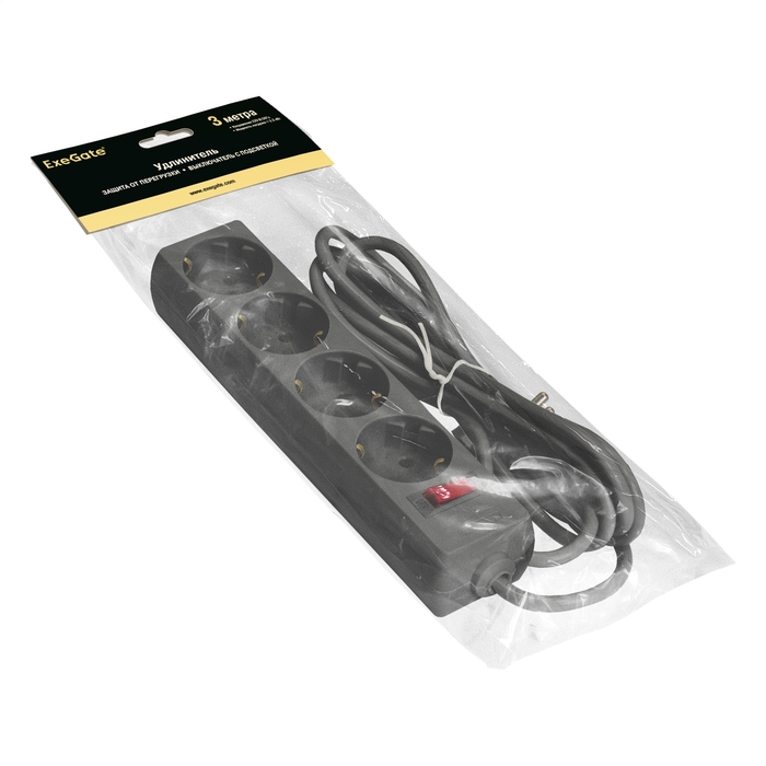 Удлинитель ExeGate EC-4-3B (4 евророзетки с заземлением, 3м, защита от перегрузки, выключатель с подсветкой, черный)