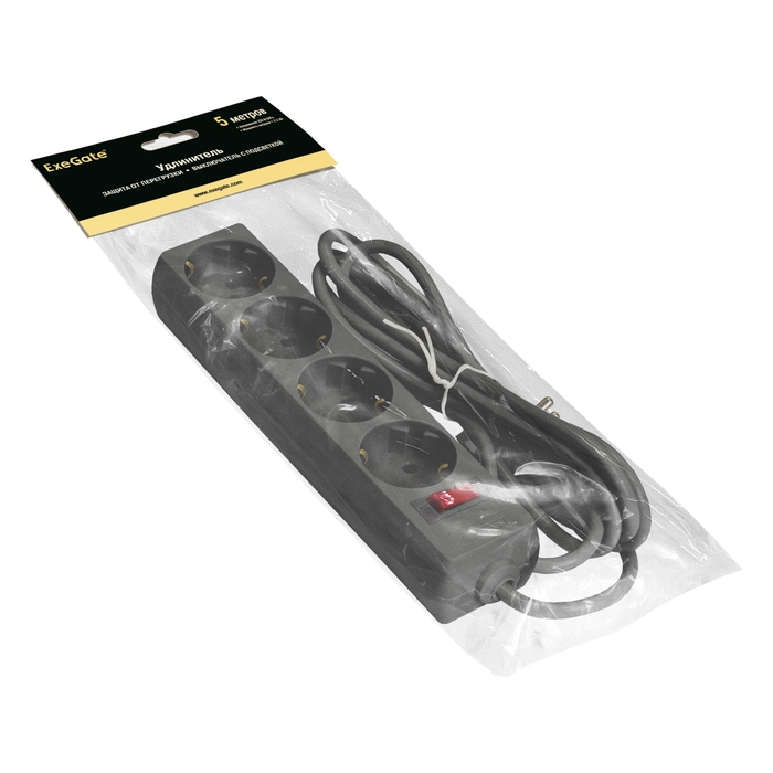 Удлинитель ExeGate EC-4-5B (4 евророзетки с заземлением, 5м, защита от перегрузки, выключатель с подсветкой, черный)