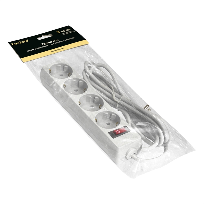 Удлинитель ExeGate EC-4-5W (4 евророзетки с заземлением, 5м, защита от перегрузки, выключатель с подсветкой, белый)