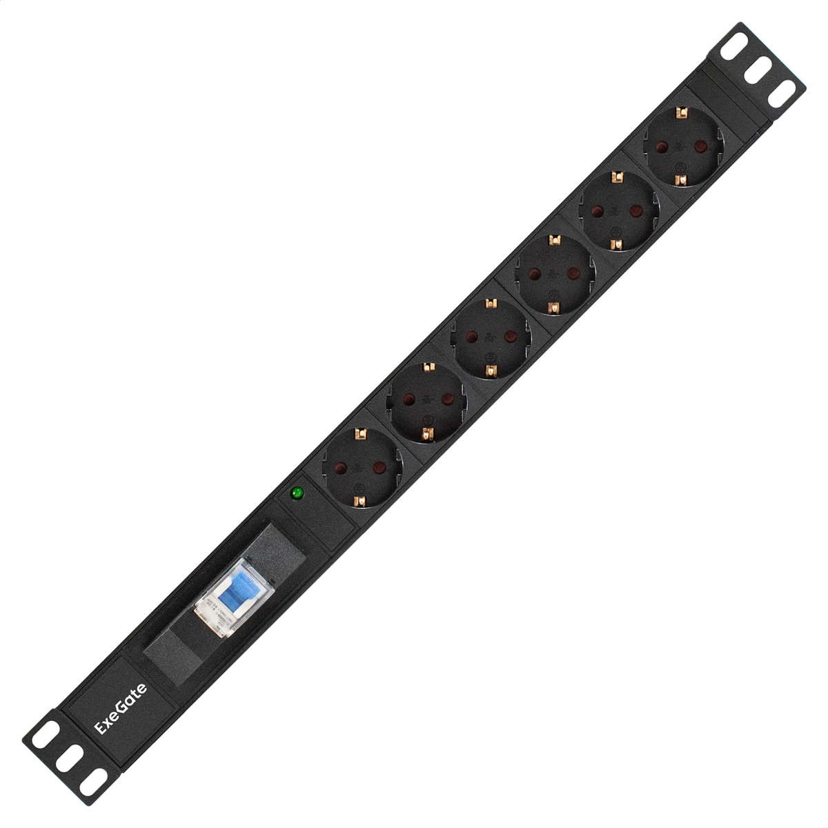 Блок розеток с автоматом защиты ExeGate ServerPro PDU-19H610 Al-6S-EU2.5CU-1P (19", 1U, Алюминий, 6 Schuko, кабель с евровилкой VDE-250V-16A-3*1.5mm2, медь, 2.5 метра, защита от перегрузки, черный, RTL)