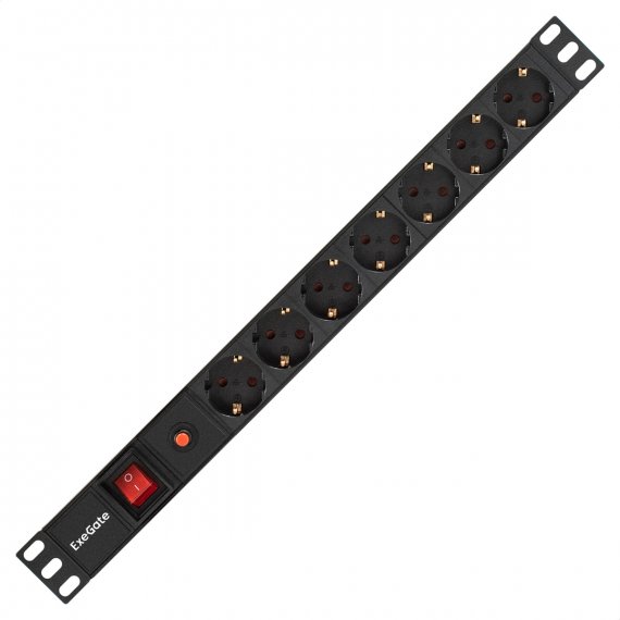 Блок розеток с защитой от перегрузки и разъемом подключения C14 ExeGate ServerPro PDU-19H702 Al-7S-C14-SW-O (19", 1U, Алюминий, 7 Schuko, C14, защита от перегрузки, черный, RTL)