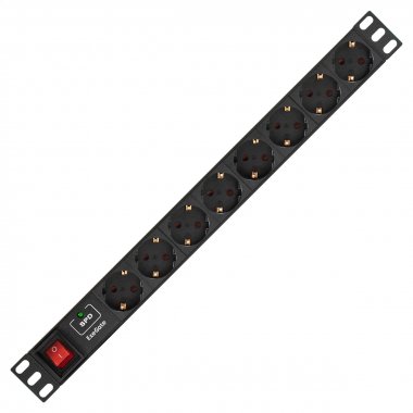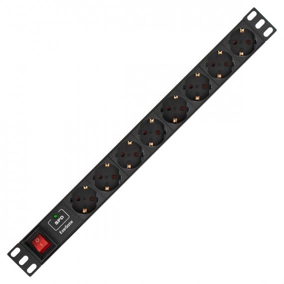 Блок розеток с сетевым фильтром (Surge Protect) и выключателем с подсветкой ExeGate ServerPro PDU-19H807 Al-8S-EU2CU-SW-SPD1 (19", 1U, Алюминий, 8 Schuko, кабель с евровилкой VDE-250V-16A-3*1.5mm2, медь, 2 метра, выкл. с подсветкой, SPD1, черный, RTL)