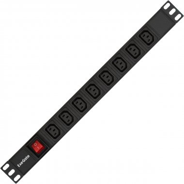 Блок розеток с выключателем с подсветкой и разъемом подключения C14 ExeGate ServerPro PDU-19H808 Al-8C13-C14-SW (19",1U, Алюминий, 8 IEC 320 C13, C14, выкл. с подсветкой, черный, RTL)