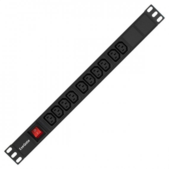 Блок розеток с выключателем с подсветкой и разъемом подключения C14 ExeGate ServerPro PDU-19H001 Al-10C13-C14-SW (19",1U, Алюминий, 10 IEC 320 C13, C14, выкл. с подсветкой, черный, RTL)