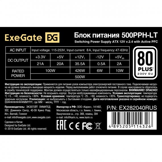 Блок питания 500W ExeGate 80 PLUS® 500PPH-LT-S (ATX, APFC, SC, КПД 82% (80 PLUS), 12cm fan, 24pin, 2x(4+4)pin, 2xPCI-E, 6xSATA, 3xIDE, кабель 220V 1,8м с защитой от выдергивания, black, Color Box)
