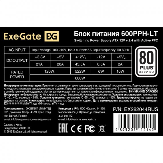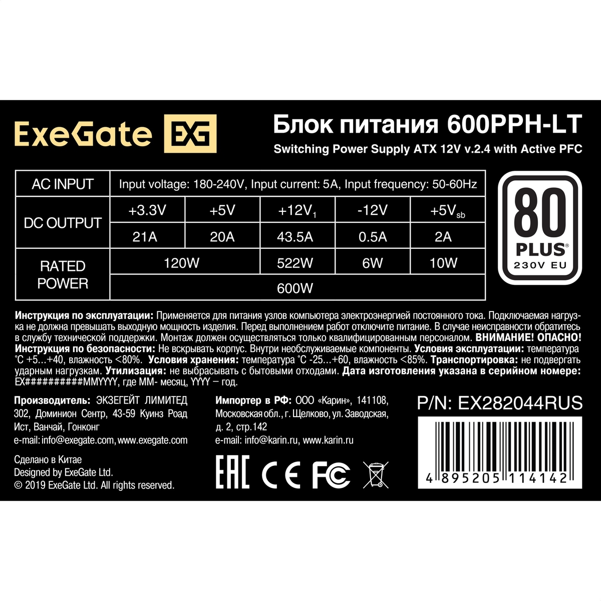 Exegate EX282044RUS-OEM Блок питания 600W 80 PLUS® 600PPH-LT-OEM