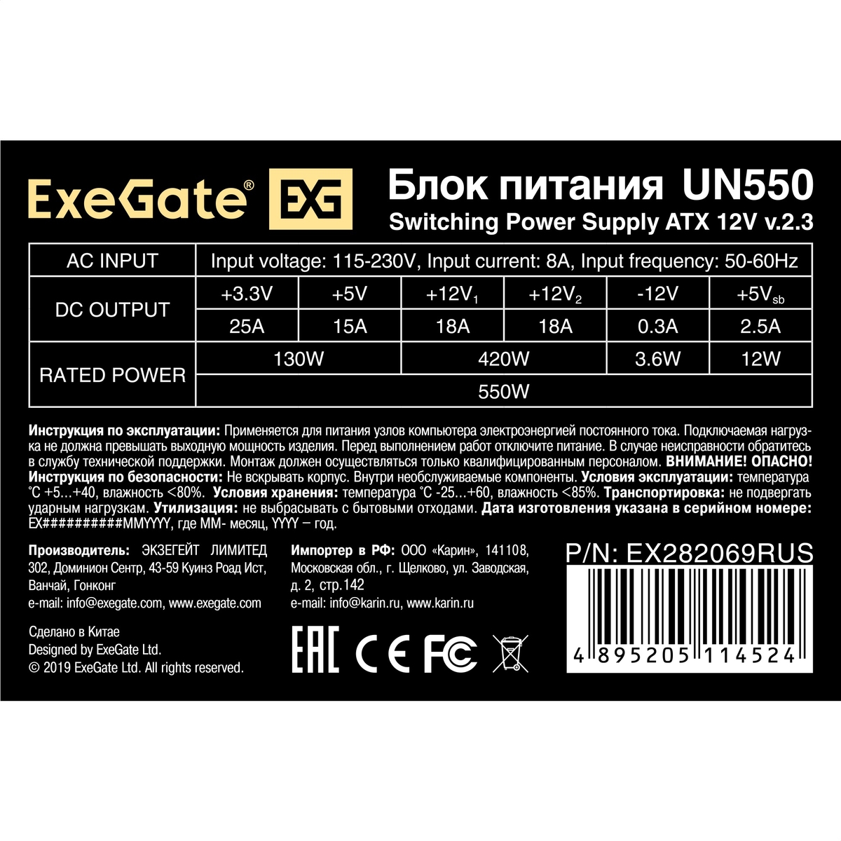 Exegate EX282069RUS Блок питания 550W UN550