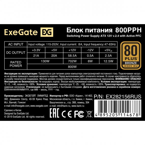Блок питания 800W ExeGate 80 PLUS® Bronze 800PPH-S (ATX, APFC, SC, КПД 89% (80 PLUS Bronze), 12cm fan, 24pin, 2x(4+4)pin, 4xPCI-E, 8xSATA, 4xIDE, black, кабель 220V 1,8м с защитой от выдергивания, Color box)