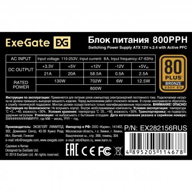 Exegate EX282156RUS Блок питания 800W 80 PLUS® Bronze 800PPH
