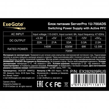 Серверный БП 700W ExeGate ServerPRO-1U-700ADS (1U, APFC, КПД 85% (80 PLUS Bronze), 2x4cm fans, 24pin, 2x(4+4)pin, 2xPCI-E, 4xSATA, 3xIDE)