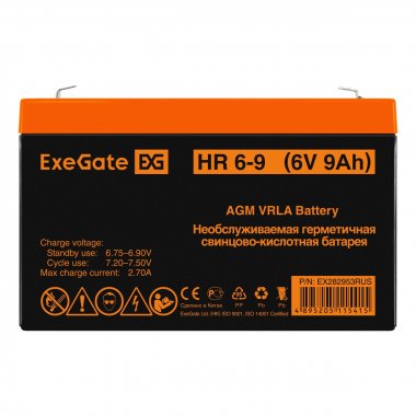 Exegate EX282953RUS Аккумуляторная батарея HR 6-9 (6V 9Ah 634W, клеммы F2)