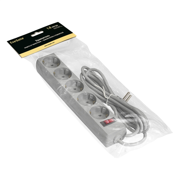 Удлинитель ExeGate EC-5-1.8G (5 евророзеток с заземлением, 1.8м, защита от перегрузки, выключатель с подсветкой, серый)