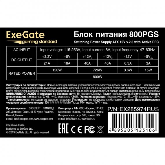 Блок питания 800W ExeGate Gaming Standard 800PGS (ATX, APFC, КПД 80% (80 PLUS), 14cm fan, 24pin, 2x(4+4)pin, 6xPCI-E, 8xSATA, 4xIDE, Cable Management, black, RTL)